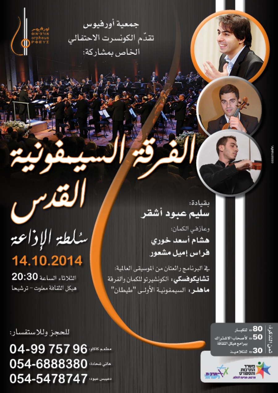 جمعية أورفيوس تقدم باعتزاز كونسيرت احتفالي مع الفرقة السيمفونية حيفا مع يوني فارحي كقائد وسليم عبود أشقر كعازف وقائد للفرقة وذلك يوم السبت 9/6/2012 الساعة 20:45 في قاعة العروض بكيبوتس مِزراع – مرفق إعلان.