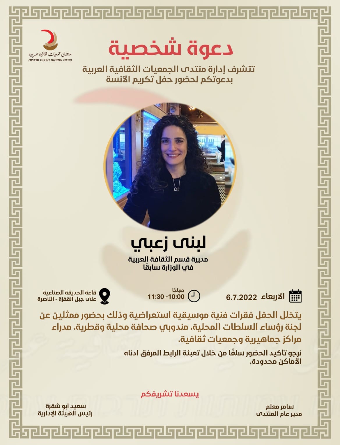تتشرف إدارة منتدى الجمعيات الثقافية العربية بدعوتكم لحضور حفل تكريم